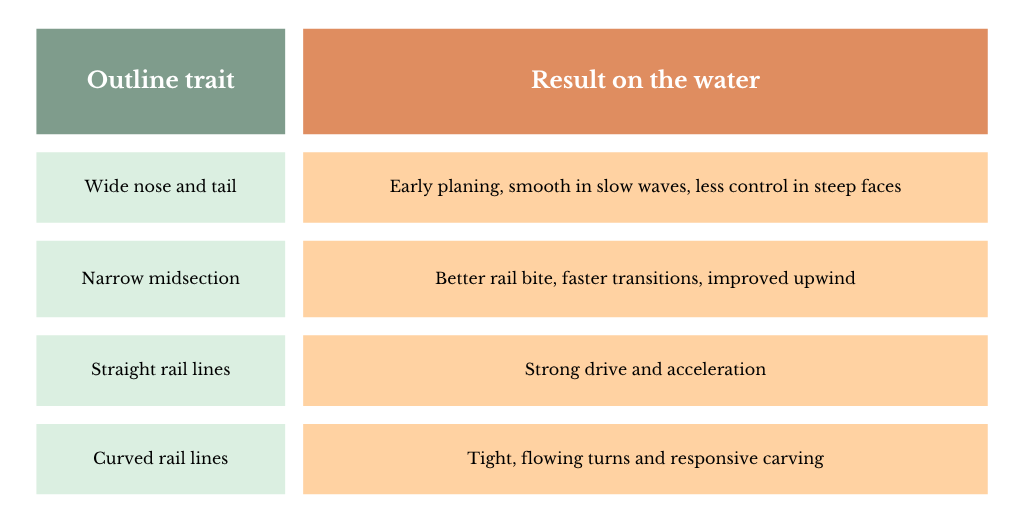 A board with more curve from nose to tail turns tighter but sacrifices upwind efficiency. Straighter outlines track better and maintain speed across sections but require more input to turn. Think of it like steering radius: curvy equals agile, straight equals drive.